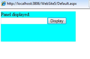 <form id=”form1” runat=”server”> <div> <asp:Panel ID=”Panel1” runat=”server” BackColor=”Aqua” Height=”100px” Width=”250px”>Panel displayed: </asp:Panel> </div> </form