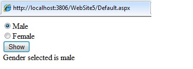 <body> <form id=”form1” runat=”server”> <div> <asp:RadioButton ID=”RadioButton1” runat=”server” Text=”Male” Checked=”true” GroupName=”gen” /><br/> <asp:RadioButton ID=”RadioButton2” runat=”server” Text=”Female” GroupName=”gen” /><br/> <asp:Button ID=”Button1” runat=”server” Text=”Show” onclick=”Button1_Click” /><br/> <asp:Label ID=”Label1” runat=”server” Text=”Label”></asp:Label> </div> </form> </body>