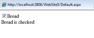 <html xmlns=”http://www.w3.org/1999/xhtml”> <head runat=”server” > <title></title> </head> <body> <form id=”form1” runat=”server”> <div> <asp:CheckBox ID=”CheckBox1” runat=”server” Text=”Bread” AutoPostBack= “true” oncheckedchanged=”CheckBox1_CheckedChanged” /><br/> <asp:Label ID=”label1” runat=”server”></asp:Label> </div> </form> </body> </html>