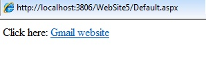 <html xmlns=”http:www.w3.org/1999/xhtml” > <head runat=”server”> <title></title> </head> <body> <form id=”form1” runat=”server”> <div> Click here: <asp:HyperLink ID=”hyp1” runat=”server” Target=”_blank” NavigateUrl= “http://www.gmail.com” Text=”Gmail website” > </asp:HyperLink> </div> </form> </body> </html>