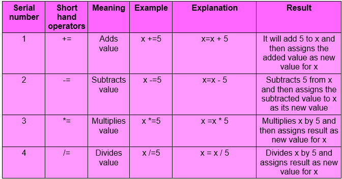 Assignment operator is used to store value in memory. In the last chapter, we studied about variables. Variable name is identifies the memory location and this assignment operator is used to copy the data or output of an expression into respective memory location. This process of copying data into memory location is called Assigning.