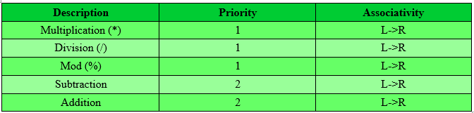 - Left-to-right associative: The operators with same priority in an expression are evaluated from left to right. These operators are also called Left to Right associative operators and the process of evaluating is known as Left associative. It is denoted by L->R.