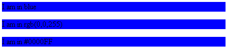 <p style="background-color: blue">I am in blue <p style="background-color:rgb(0,0,255)">I am in rgb(0,0,255) <p style="background-color:#0000FF">I am in #0000FF