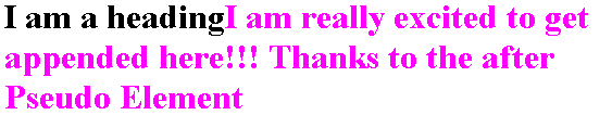 Content: “I am really excited to get appended here!!! Thanks to the after Pseudo Element”;