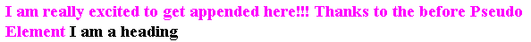 Content: “I am really excited to get appended here!!! Thanks to the before Pseudo Element.”;