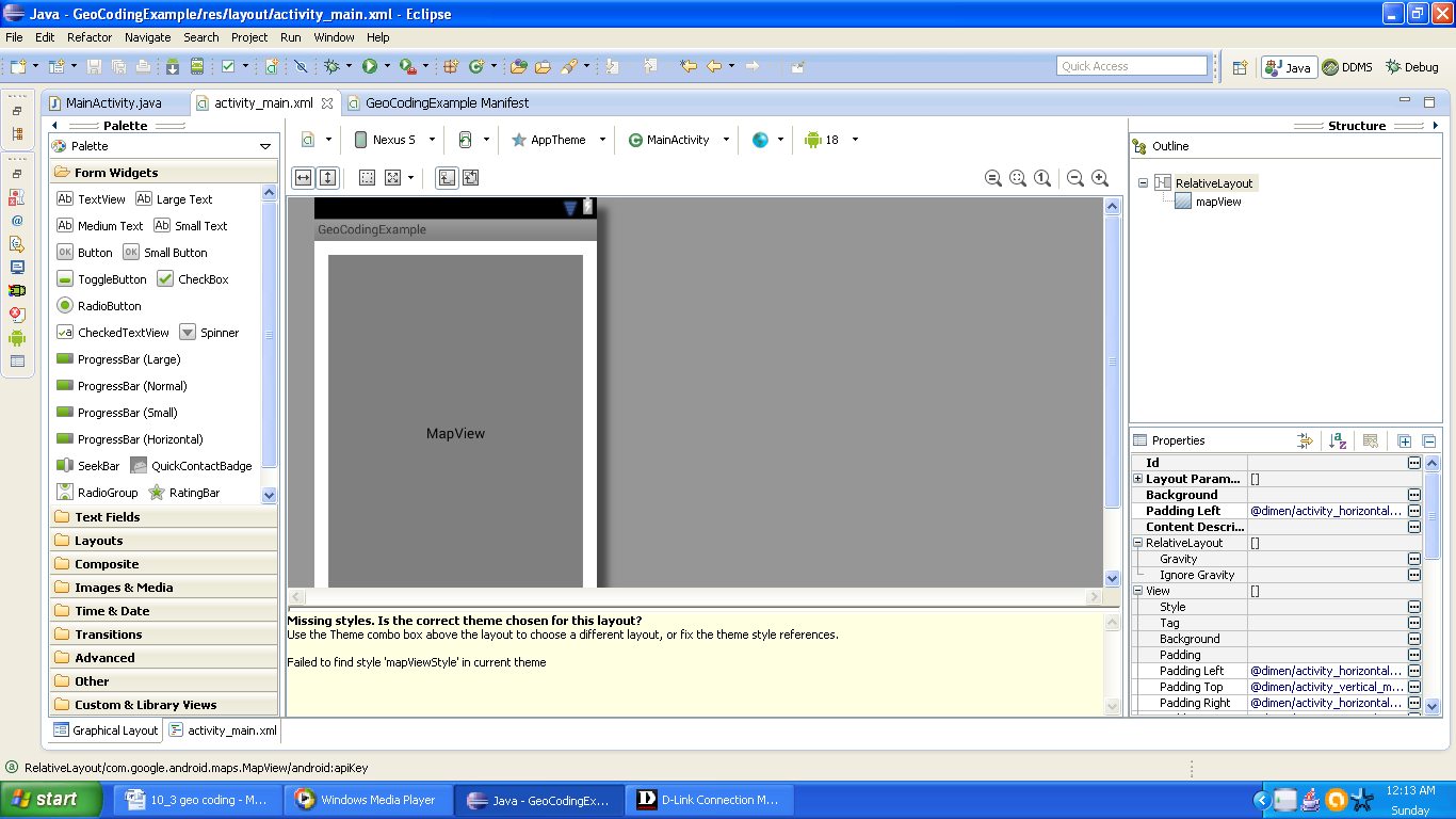 Create a project and name it as you like. I am naming it GeoCodingExample app. This is an advanced example as we will use maps. So you can study just as a demonstration. We will cover maps very soon. For demonstration purpose we have quoted this example. You can code this as it is and run the application on your system. In this project we will retrieve the location in terms of latitude and longitude. After one or two seconds, street address of these coordinates will be displayed on screen of your emulator. Open the activity_main.xml file and code it as shown in the following snapshot: