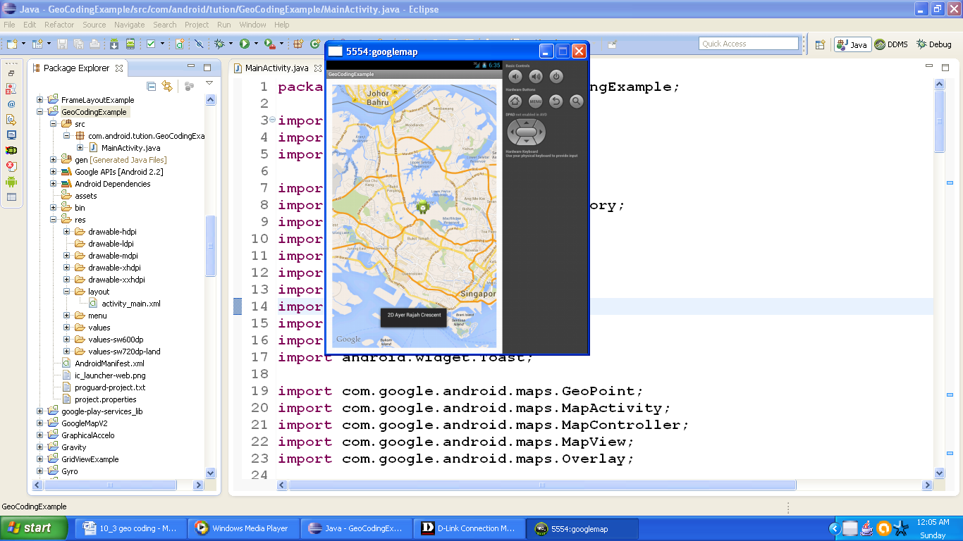 While running this project you must be online otherwise the map would not be displayed as it is displayed in the attached snapshots. The street address of this co-ordinate is as shown in the following snapshot: