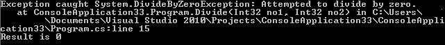 In the above code snippet the DivideByZeroException is thrown. The exception is thrown when an integer value is divided by zero. When the divide statement is executed, it returns a runtime error. The program is not guarded for exceptions, the default exception handler is invoked. The default exception handler displays the error message and allows user to troubleshoot the problem.