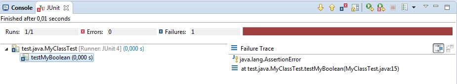 getMyBoolean() returns false so the assertFalse() method will return normally and assertTrue() method will fail.