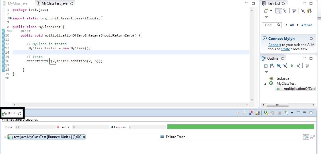 In order to launch the test in Eclipse right – click on the test class MyClassTest.java and select Run As > JunitTest.