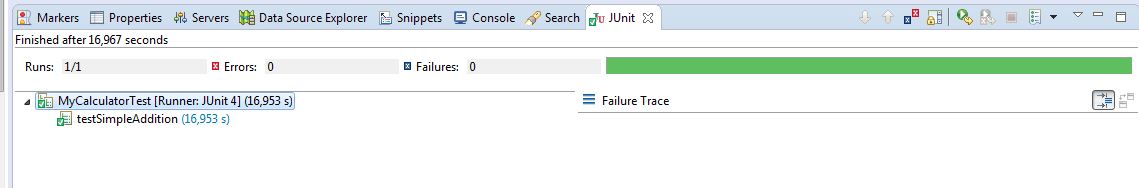 We can launch the JUnit test from the Run Configuration option or simply click right on the test class and choose Run as JUnit test.